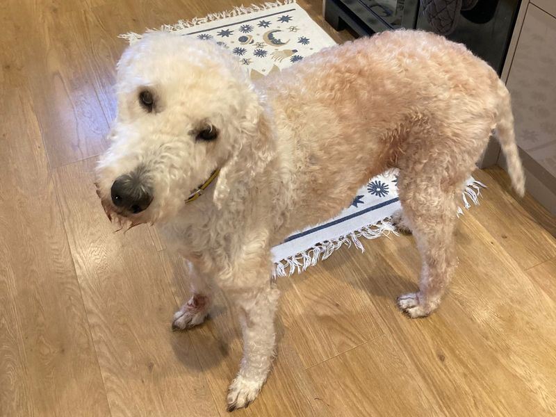 Dougal is a 12 year old labradoodle looking for his retirement home. He is gentle, loving and is good with everyone he meets. Dougal maybe an older boy but he still likes to go for walks and although he is a bigger dog he walks beautifully on the lead. He enjoys playing with his squeaky toys and loves to carry a slipper around. He could live with another calm dog and sensible children 8+. He is able to be left 3 - 4 hours and enjoys cuddles on the sofa.
