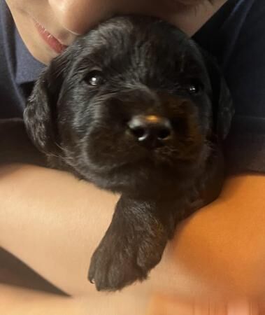 Beautiful, curly jet black F1 labradoodles born 31/05/2024 and available July 26th, just in time for the summer holidays.